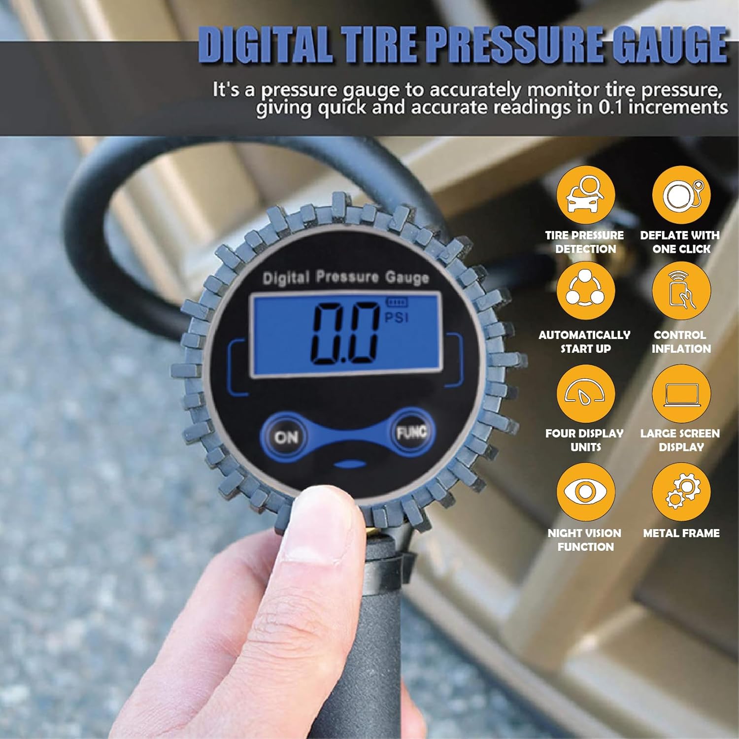 ALL-IN-ONE FEATURES: The LED backlit screen features measurements in PSI, KPA, Bar, and Kg/cm^2; Includes an inflator, straight locking chuck, gauge, hose, bleed valve, all in one unit, ideal for cars, bicycles, motorcycles, balloons, air cushion, sports balls and so on; Compatible with ¼” NPT air compressors output